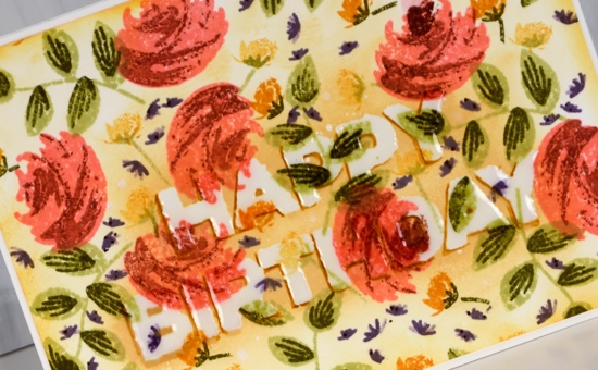 I filled it in with tiny dusty concord flowers stamped twice just slightly offset to get two-toned flowers in all the gaps. To make the half hidden sentiment I stamped with versamark and embossed twice with WOW clear ultra high powder. To make the clear embossed sentiment show up I sponged antique linen ink over it; that was a bit too subtle so I switched to wild honey. Still too subtle I grabbed the wild honey marker and drew some shadows around two edges of each letter.