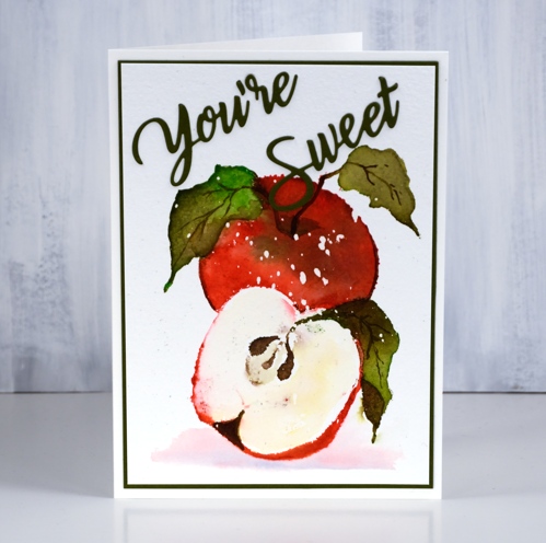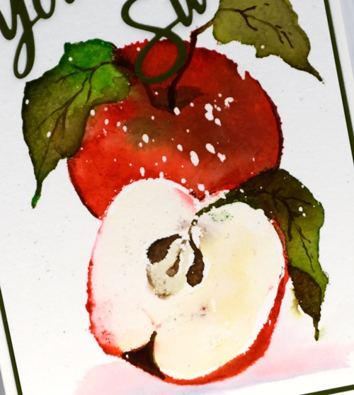 You’ve probably noticed my apple looks like it is in a snow storm. I worked on cold pressed watercolour paper splattered with masking fluid, probably not entirely necessary for a close up apple image but I’m claiming artist’s licence. I had splattered masking fluid over a batch of cold pressed panels in preparation for the all day crop as I was planning to work mainly on snow scenes. When I went to assemble the card I thought the apple needed a bit of shadow to ground it so I painted some diluted festive berries and chipped sapphire ink because they were in reach on my desk. As is often the case for me, I left any thoughts of a sentiment until the end. After a search through my sentiment dies I settled on ‘you’re sweet’ then matted the panel in the same green cardstock.