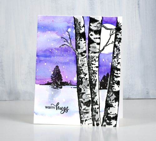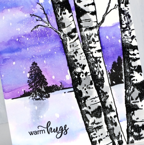 I placed some masking tape across the birch trunks then stamped the distant trees stamp from the ‘peaceful winter’ set in nocturne ink. The distant trees gave me a horizon line above which I painted my distress ink sky. I pressed both wilted violet and blueprint sketch inks onto my glass mat, added a little water and painted the sky. By letting the ink dry slightly between applications I was able to get some darker ‘dried’ lines in the sky. Once the sky dried I removed the moon mask.