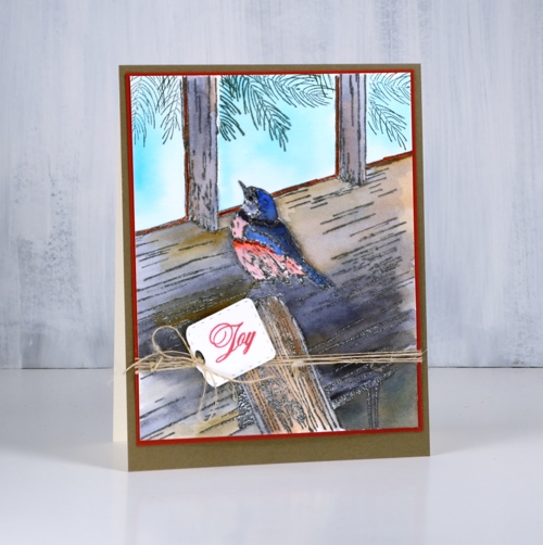 I stamped in versafine clair nocturne ink and embossed in clear powder then painted the bird and all the wood with my peerless watercolours. To create variation in the wood I painted with several browns and some warm mustard yellow as well. Once I had finished the woodwork I had to decide how I would do the window. I chose frosty patterns like we often get on our windows in winter so I used the delicate snowflake stamp from the PB set, ‘A bright tomorrow’ to emboss in clear powder. When I painted pale blue into the window area it resisted the snowflake shapes.