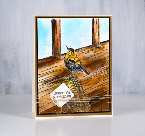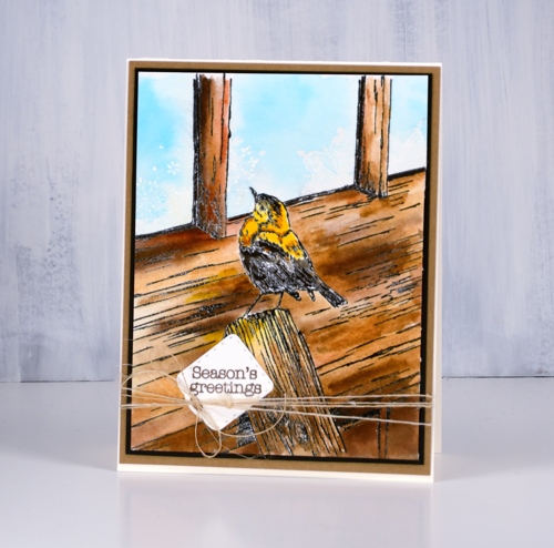 The second installment of my ‘stamping is for the birds‘ series features the Penny Black stamp ‘Winter lookout’ with a little bird on the outside looking in. I have seen a few other beautiful cards using this stamp and wish I had added a little foliage but there is always next time. Take a look at this gorgeous card by Susie Lessard.