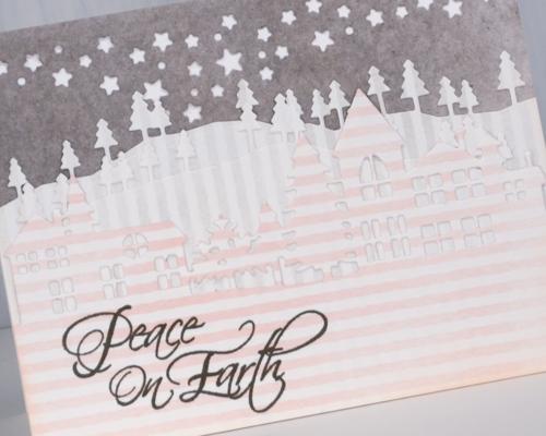 I have been wanting to try a white on white layered die cut scene and I probably still will but chose to try it with these pretty papers first. The neighbourhood is layered over two layers of trees cut with the ‘trees and hills’ dies which are layered over a gray piece cut with the starry sky night die attached directly to a white card base.