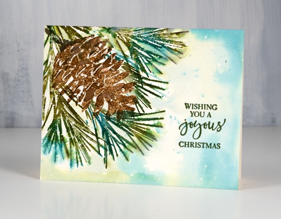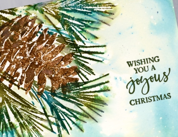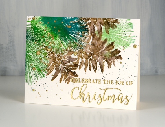 For the second card I switched pine needle stamps but kept the same pine cone. I stamped the needles first in mowed lawn and pine needles distress ink. Again I didn’t want to cut some fiddly masks so I did partial inking instead to position the pine cones in amongst the needles. I blended them with a fine tip paint brush then splattered some green and brown inks over the panel. I wanted a splash of gold so I embossed a sentiment from Yuletide greetings in ultra high gold embossing powder which is chunkier than some.