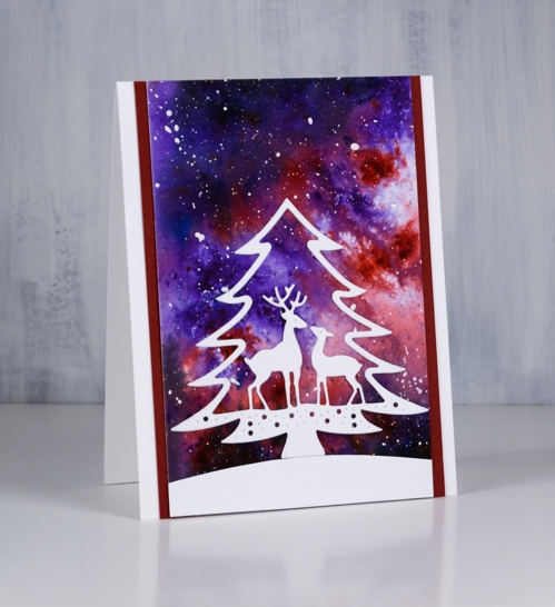And now a bonus card made with my last watercolour sky piece. I matted it on two sides with burgandy cardstock then cut a snow bank and the ‘deer in tree’ die from neenah solar white cardstock. It is a pretty die but would the deer be standing in a tree? I think not!
