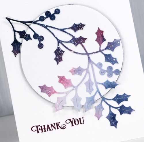 I have a few more simple Christmassy cards to share; these ones are kind of the opposite to the ones in the previous post. I had a large watercolour galaxy panel with white splatter (aka ‘stars’) all over it. I die cut three branches from the panel to pop up on three white card bases.