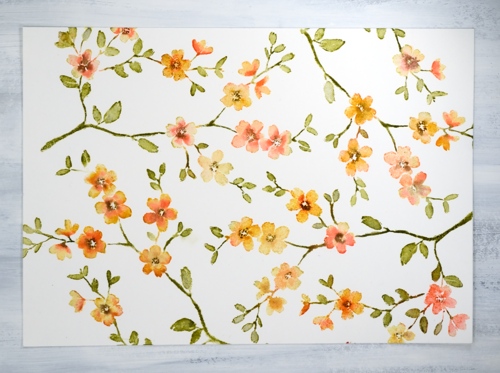 Each time I stamped I followed the same order. First I inked the whole stamp in scattered straw distress ink and dabbed some wild honey and abandoned coral ink here and there on the flowers, spritzed it with water. After stamping I cleaned the stamp, then inked all the stems and leaves in peeled paint ink, spritzed and stamped again. I kept partially inking with markers, spritzing and stamping until the flowers were well coloured. Before moving the panel and stamp to do another print I blended over the stamping with a paint brush and water.