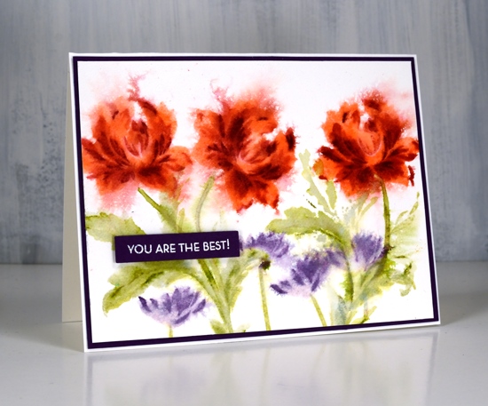 The second panel was stamped with less spritzing during the stamping process, just a little in fact on layer number two. Instead I waited until all the stamping was done and spritzed in one direction to make the petals feather out then the other direction to balance things. This time I used abandoned coral, fired brick and aged mahogany inks for the roses, milled lavender and dusty concord for the little flowers and old paper, shabby shutters and peeled paint for the leaves. Even though it looks like black, I matted the panel with purple cardstock and added an embossed sentiment also on purple and cut it out with the Avery Elle sentiment dies that are making me neat and happy right now.