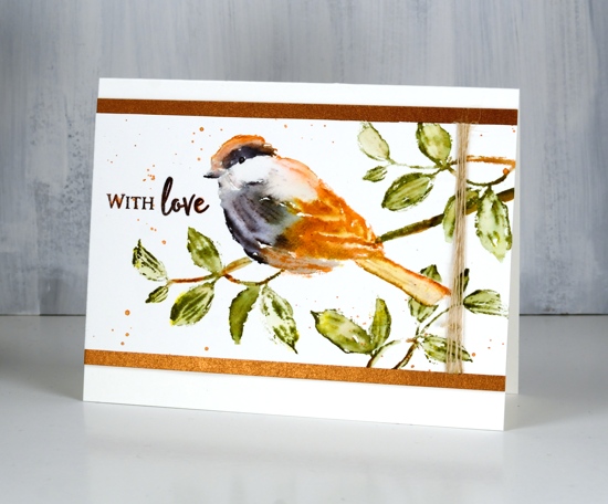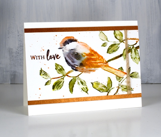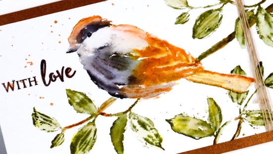 I dried the bird completely before stamping the leaves so the wet ink would not run from bird to branch or vice versa. I didn’t feel like cutting a mask so I partially inked the branch then stamped it beside the bird. I added more ink on the branch little by little to avoid stamping over the bird; the stamp positioner makes this easy. I did the same to add two more bits of branch then blended them with a bit of water. I splattered a bit of the rusty brown ink over the panel, stamped the sentiment from ‘butterfly garden’ set in brown stazon, added some twine then matted with a piece of copper coloured cardstock.