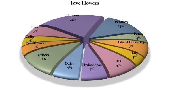 Thank you to everyone who participated. I loved reading about your favourite flowers; some of them were new to me so I had to look them up! I made a chart to show you what the top faves were; I couldn’t give everyone’s choice a piece of the pie as the labels became impossible to read! I enjoyed reading why they were faves too, many of you associated a flower with a memory, a person, a colour or a fragrance.