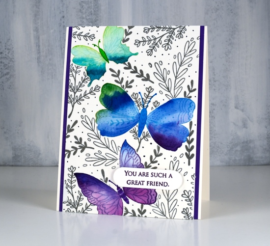 I used peerless watercolours to fill each butterfly with colour starting with a light green then blending to darker greens to fill the wings. I then added green first to the middle butterfly and blended into blue and a little bit of purple. The last one I blended from blue to purple. I stamped them again on masking paper, cut them out and covered the watercolouring before stamping leaves all over the panel in morning mist versafine clair ink. As I wanted to fill the panel with lots of stamping I used acrylic blocks so I could easily turn the stamps around to fit them in all the spaces. I drew little dots in grey marker to fill the background even more.