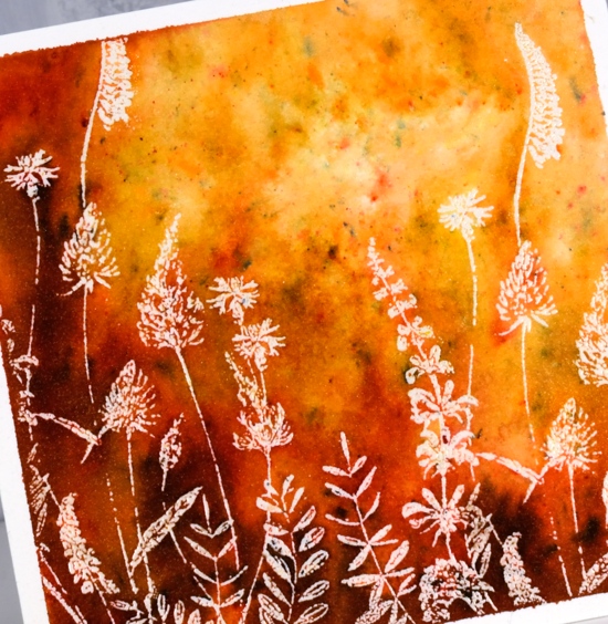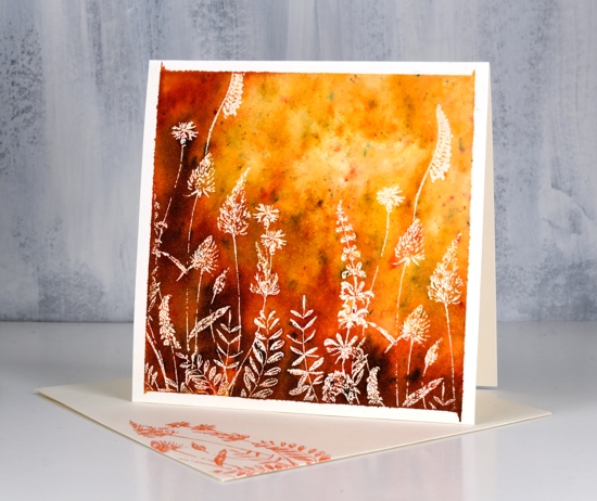 Two brilliant and bright Brusho backgrounds Heather which are the perfect backdrop to the emboss resist stamping using these pretty flowers. I adore the stamping on the envelopes too. x