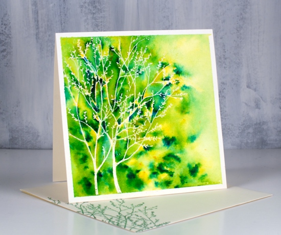 I wanted the white frame effect on today’s panels so I taped them down firmly with frog tape before doing any painting. A little colour leaked under the corners on the second panel but that didnt worry me. I attached the panels to cream card bases and stamped the same image on cream envelopes. I decided not to add sentiments on the front this time; I can always add one inside.