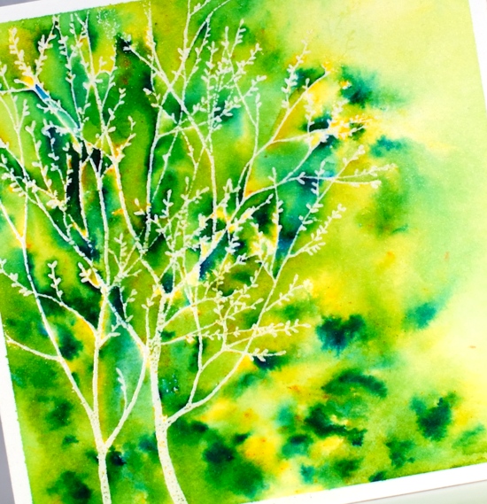 On this first panel I did what I have just described, I let the powders ‘fall where they may’ and did minimal blending with my paintbrush. I used only lime green brusho and sprinkled mainly where the embossing was then used the paintbrush a little to make sure paint filled every nook and cranny and to blend diluted colour to the right of the tree. The stamp is PB trees in bud embossed in clear powder on hot pressed watercolour paper. The stamp below is ‘a floral twist’ also from Penny Black.