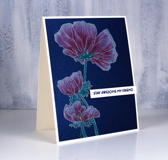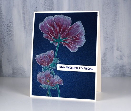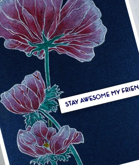 I’ve been enjoying some pencil colouring lately, especially on ‘Stardream’ shimmer paper. (this background is stardream lapis lazuli) Working on a  dark background requires a different approach but the results can be quite eye catching. I stamped a few of the ‘wonderland’ poppies from Altenew on blue shimmer cardstock with antique linen distress oxide ink. The oxide ink ends up looking almost white on such a bold background.