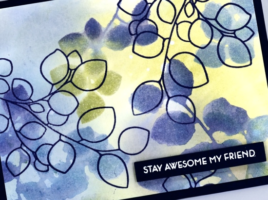 I have been bombarding you with three colour projects lately partly because I have a challenge running with the Foiled Fox but also because I love the simplicity of working with only three colours. Today I’m sharing here and on the Foiled Fox blog. I picked an analogous colour scheme which means the colours are all side by side on the colour wheel. The result is harmonious rather than bold and contrasting. I used stamps from the Altenew set ‘leaf canopy’ for both cards. Before I started stamping I pressed three distress ink pads face down on my glass mat and spritzed water over the inks until they started to run together. I swiped my panel of hot pressed watercolour paper through the colours, chipped sapphire, stormy sky and shabby shutters creating a soft blended background. I dried the panel completely before putting it in my stamp positioner. I inked the solid leaf stamps with the same three colours, spritzed them so the colours bled into each other on the stamp then closed the MISTI lid onto my panel and kept it down for 5-10 seconds. When I lifted it I had soft blurry leaf images. Any areas with excess ink pooling on them were easily fixed with the corner of a paper towel to sop them up. Again I dried the panel with a heat tool before stamping the outline leaves in chipped sapphire ink. I used my favourite sentiment from the same set and embossed it in white on navy cardstock. I used the Avery Elle simple sentiment dies again to cut it out – I can’t stop using them, I guess you have realised that by now!