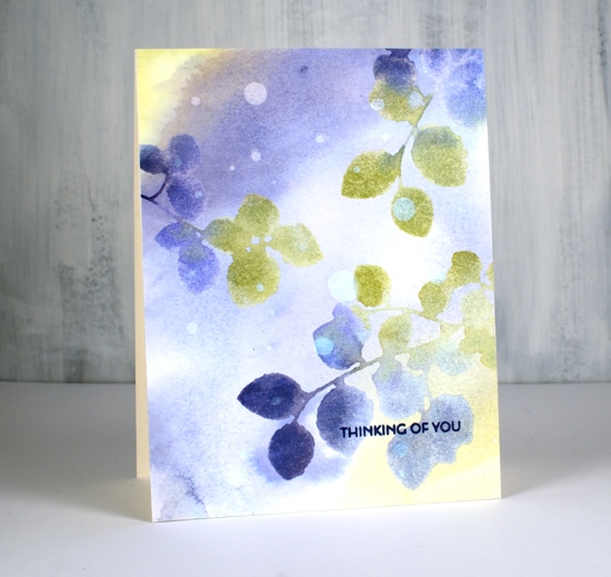 For my second card I switched one ink colour, instead of stormy sky I used shaded lilac so there are more purple tones in this one. I made the background the same way and did the stamping the same way but then took a bit of time adding water droplets strategically not in a splattery way. I wanted them to look random so I took care to place each one with a drop on the end of a paintbrush! I let them sit then absorbed the water with a paper towel leaving a pale circular watermark on the panel.