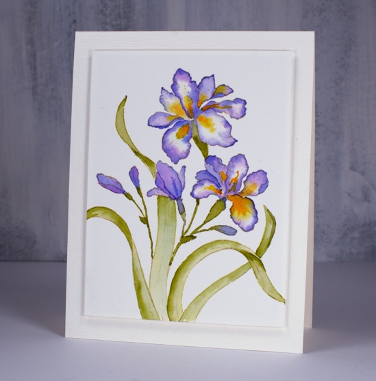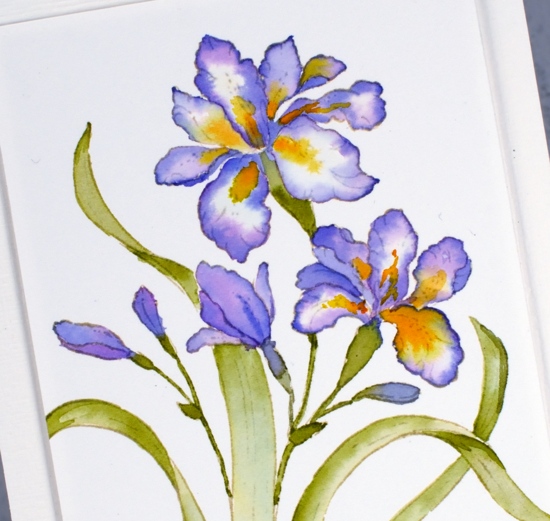 Gorgeous irises Heather and the tradition colour we all think of is this pretty purple. I adore the no line colouring and the way the edge of each of the leave is darker which makes it stand out beautifully from the white background. We went to one of the garden’s locally which was open for charity and their was a beautiful yellow iris with three large dark red patterned petals and a pretty yellow feathery centre, so exotic and pretty. It was really striking and my husband took a photo of it. I am looking forward to see what other colour combinations you use. x