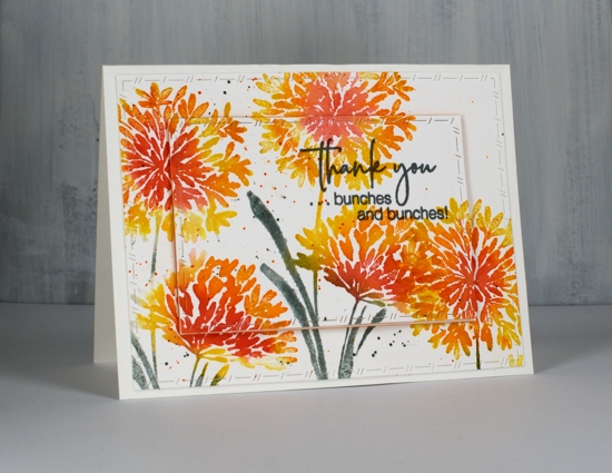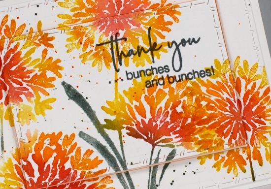 I worked in the stamp positioner so I could add a colour or two at a time and started by inking the centres of the flowers with festive berries, you could use the ink pads or the marker. I used the ink pad and wiped ink off any area where I didn’t want it. Around the festive berries I inked with ripe persimmon ink, spritzed the stamp and stamped on hot pressed watercolour paper. I wiped off the stamp then inked the outside petals in fossilized amber (my current fave yellow), spritzed and stamped again. Spritzing helps the colours blend and helps the ink give more solid coverage.