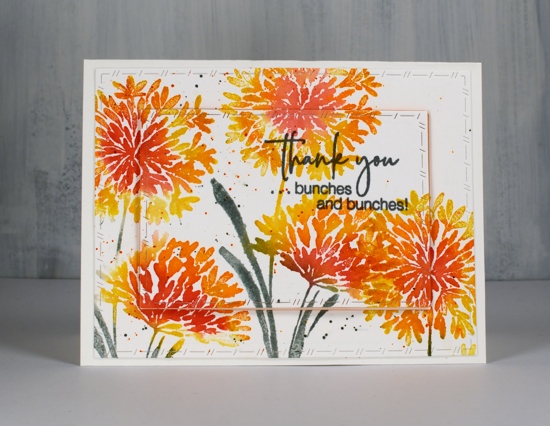 I inked the leaves in iced spruce because the time has come to hang out with other green inks; forest moss will always be special to me but there are other greens out there that need to be seen! I moved the panel and repeated the stamping to the left and to the right almost filling it with flowers. I added some orange and green splatter then die cut with the ‘PB stitched nested frames’ dies. The sentiment is inked in versafine clair misty morning ink because I thought the grey worked with the iced spruce leaves. The centre panel is popped up on a piece of foam for a bit of extra interest.