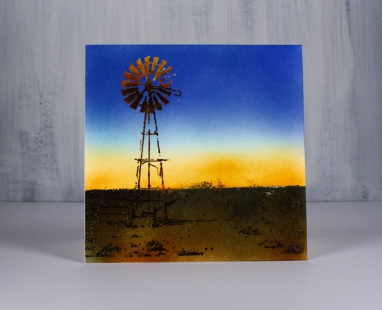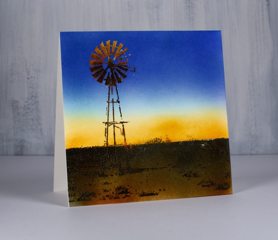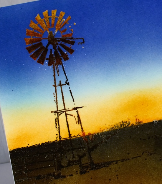 I started by stamping the windmill and grasses in wild honey, rusty hinge, gathered twigs and black soot distress ink. I used markers and ink pads to darken the colour moving down the structure. The base of the windmill and the grass silhouettes were completely black so they would be visible even when I added a dark background. The ‘wild honey’ sections of the windmill appear to be reflecting the last rays of sun in the evening. It is winter in Alice Springs right now so the days are short; I was surprised each day by the early nightfall. Once the windmill and scrubby bits of grass were stamped to my satisfaction I inked the whole stamp in versamark and embossed in clear powder. This is a technique I have seen Jill Foster use on scenic stamping. With all the colour on the windmill and grass ‘sealed’ in by embossing I was able to add all the background colour without altering the windmill or grass at all.