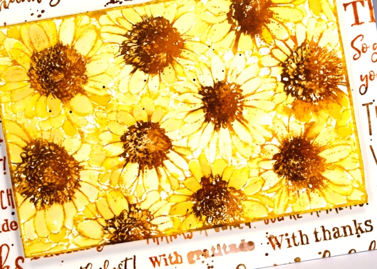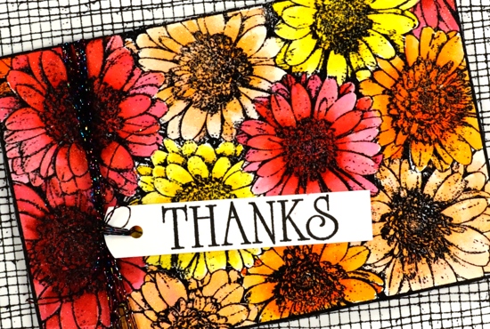 I tried a woodgrain background but it was too dark. By choosing to stamp the ‘thank you’ sentiment strip several times more of the cream background showed through. I inked the sentiment strip in vintage photo and rusty hinge distress inks and spritzed it lightly before each print. The result was blended and sometimes smudgy words. I gave both the flower panel and the background the splatter treatment then popped the gerberas up on a foam rectangle.