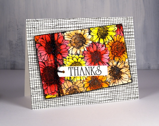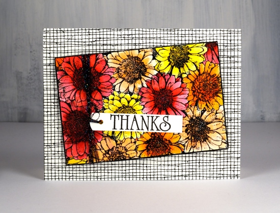 I stamped in black ink and embossed in clear powder on hot pressed watercolour paper then used zig clean color real brush markers for colouring. I started each flower by colouring around the centre with the marker then blended out the colour with a brush and water. I was able to add more with the markers as needed. To give the flowers even more pizaazz I gave them all a layer of clear wink of stella. (the red and pink ones then got a coat of micro glaze because I kept touching them and getting pink and red stains on things that were not meant to be pink or red!) I wanted to mount the flowers on a background but didn’t want it to fight with the focal panel. The DD mesh stamp worked beautifully and reminds me of the decorative mesh that is sometimes wrapped around cut flowers.