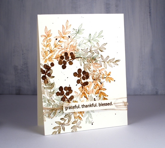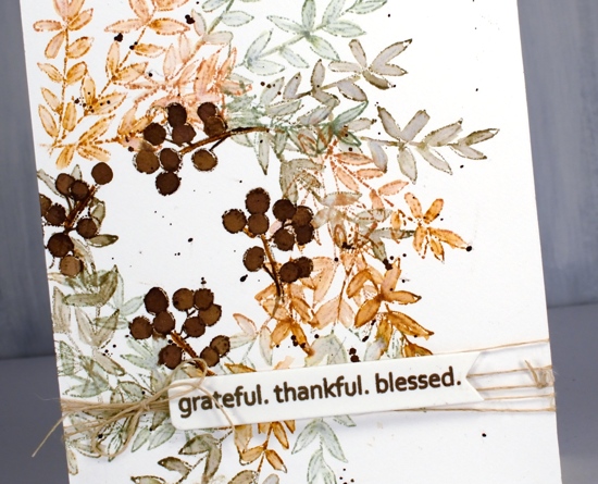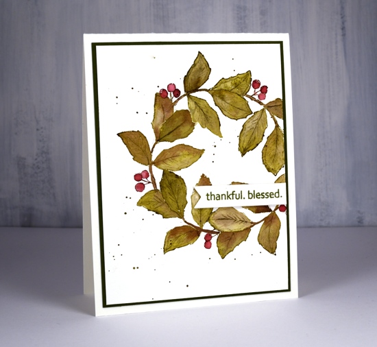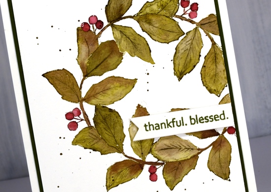 For the second card I grabbed another stamp from all natural and used the same process but needed a leaf mask cut from post-it note a couple of times where the leaves would have stamped over previous ones. This little stamp has both leaves and berries as well as a curved stem which just happened to conveniently match the curve of my traced circle. I used the same technique of blending the leaves and berries after stamping with forest moss and aged mahogany distress inks.