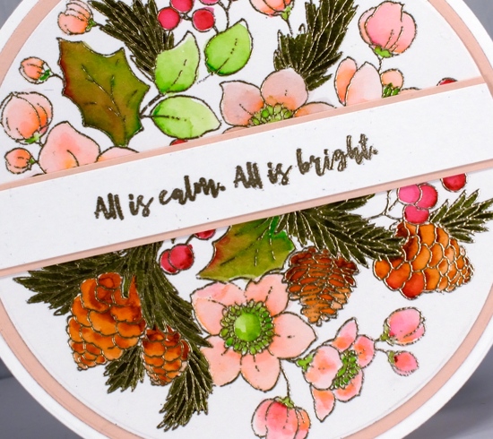 I worked on Koh-I-Noor Bristol Smooth Bright White Paper and embossed the image in platinum embossing powder. I was keen to see how the Zig clean color real brush pens worked on bristol as many artists prefer bristol to watercolour paper for the zig pens. The results were very pleasing the pens blend beautifully on bristol. I wanted pale pink flowers and tried light pink and tea rose then ended up using both for a blend from the slightly bolder pink to the paler tea rose. The berries I coloured with wine red, the rounded leaves with light green and the holly leaves with a blend of wine red and light green. I used brown for the pine cones and blended it with water for variation in depth. The needle leaves are olive green. The zig pens are very highly pigmented so a little goes a long way. I was able to colour the elements on the panel by applying a small about of ink then blending it to fill the space with a wet brush.