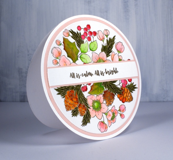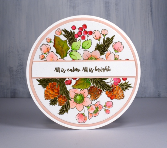 If you haven’t seen the incredible artistry of Peet Roeven you need to click over to her blog right now. Her attention to detail and precise fussy cutting is impressive. My card today is inspired by a recent card of Peet’s, mine is nowhere near as detailed as hers but I was able to show off this pretty ‘winter garden’ stamp in a circular setting just as she did. I never think of doing circle cards but the stamp is circular so it does make sense and Peet’s beautiful card nudged me to give it a try.
