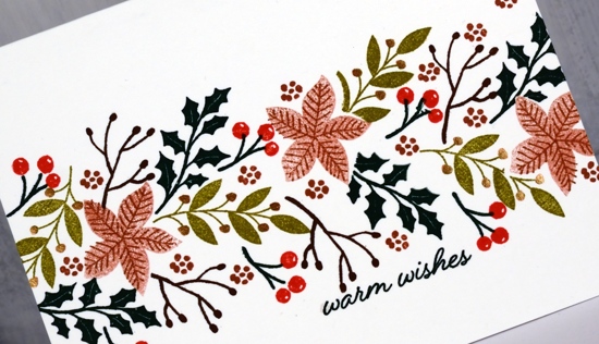 I worked on these two cards side by side on my glass mat. I taped the second one down with post-it tape using the grid on my mat to get the tapes lined up so they would mask off a band across the card front. On this first card I just taped down a couple of corners to keep the card steady. The only time I used my stamp positioner was to add the sentiments at the end. For the card above and close up below I used an earthy colour scheme of greens, brown, red and pops of gold. I used Papertrey ink cubes ripe avocado, pine feather, dark chocolate, Americana and distress barn door. It made sense to start with the poinsettias as they were the biggest, next the larger leaf sprays and finished with the berries and little flowers. I added finetec gold paint over the berries on the green leaf sprays to add some shimmer and make the berries stand out. There are matching dies for these sets so I cut a poinsettia shape from a post-it note to do a little masking when I wanted to pop leaves behind.