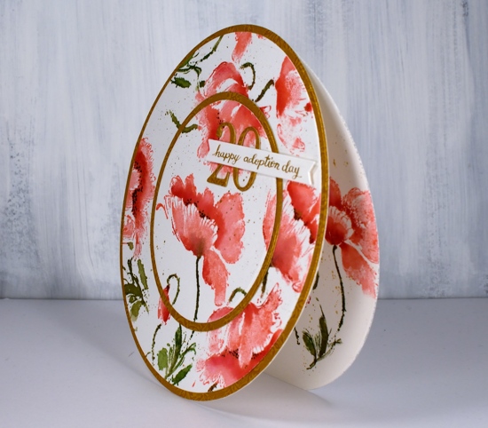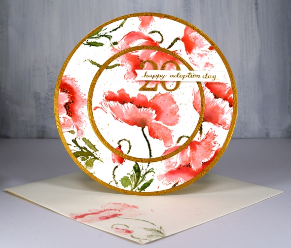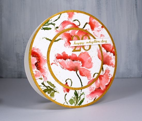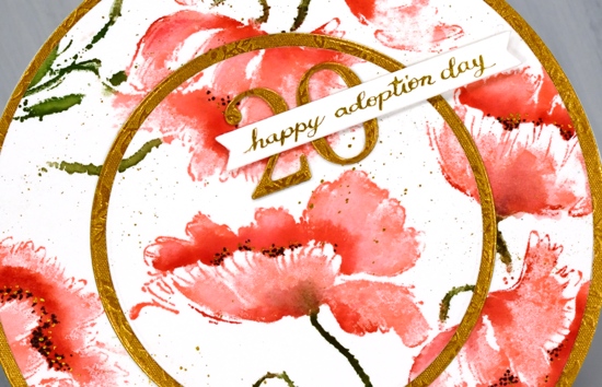 What a treat it was to design and make this card at the request of a friend of mine. Her daughter, also a friend of mine celebrated the 20th anniversary of her adoption day yesterday so an extra special card was needed. Inspired once again by the beautiful round card made by Peet Roeven I chose the PB stamp ‘spontaneous joy’ and a red and gold colour scheme. I worked in a stamp positioner to add colour to the flowers gradually beginning with worn lipstick distress ink for the petals then candied apple distress ink for extra depth and shadow. I blended a little with a paintbrush and water but I didn’t want to lose the detail by blending over all the stamping.