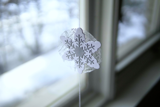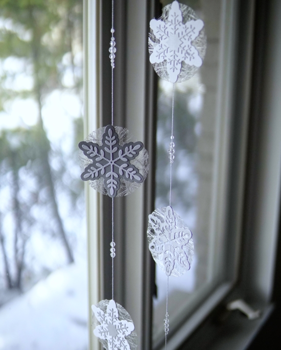 I ended up with six snowflakes on each garland with clear beads grouped on the twine in between the snowflakes. Each snowflake is actually double sided so the twine is glued in between the two and for some I glued a contrasting snowflakes on each side.