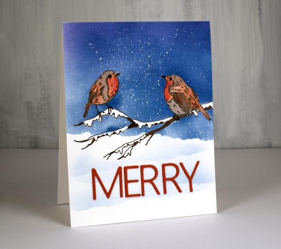 I chose the Papertrey ink cubes that I have been using over and over to stamp little wreaths and foliage patterns. To watercolour with them I squished dark chocolate, Americana and scarlet jewel onto the glass mat where I could add a drop of water and pick up colour with a paintbrush.  I found an image of a European Robin as my guide and painted the breast with the two red inks, the Americana was too brown, the scarlet jewel too pink but the mix was ideal.  For the wings and tales I used a mix of Americana and dark chocolate and the rest of the body I painted with distress hickory smoke. I went over the beak and eyes with a black micron pen and then painted the branches in a mix of dark chocolate and black soot. Once that dried I went over the birds’ feet with the micron pen.
