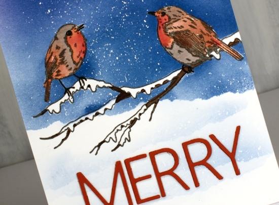 What a beautiful card Heather and I love that blue snowy sky and the pretty robins are coloured perfectly, and the contrast between the blue and white with a hint of blue for the snow banks is gorgeous. I adore it as robins at Christmas are my no.1 favourite. x