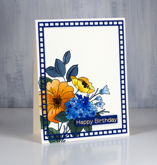 I love your restricted palette Heather which works beautifully on these pretty flowers and the gold on blue sentiment and blue frame complement it perfectly. x
