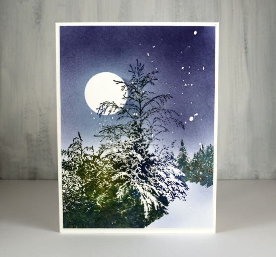 As you can imagine, I was thrilled when I saw this stamp. Yes it is one stamp with all these beautiful trees in a snowy clearing! It’s called wintertide and it definitely portrays what I am seeing outside these days.