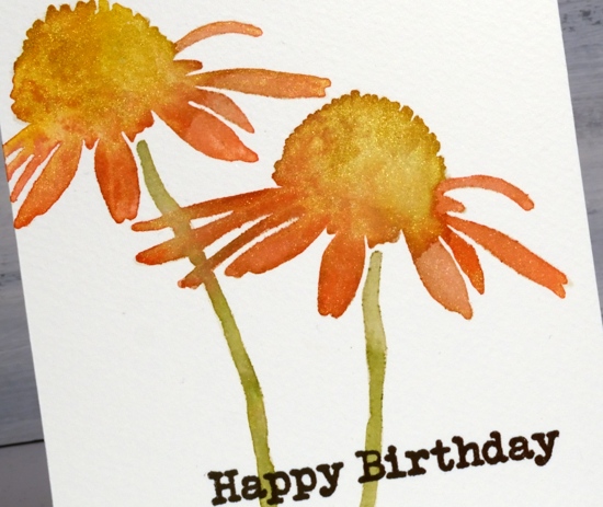 I smooshed the ink pads on my glass mat and added a little gold shimmer with a few drops of Ken Oliver’s ‘yellow gold’ liquid metals. The shimmer isn’t very obvious in the photos but in real life it adds a little pizazz!
