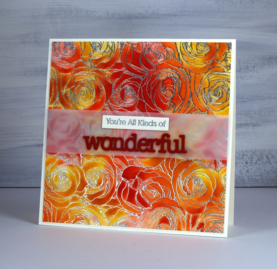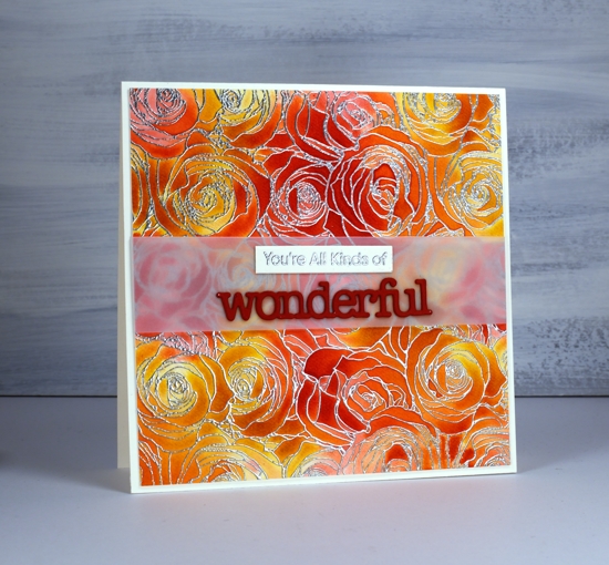 I love your beautiful bright fiery colours Heather for your pretty all over embossed flowers, and the vellum works beautifully for the sentiment too. x