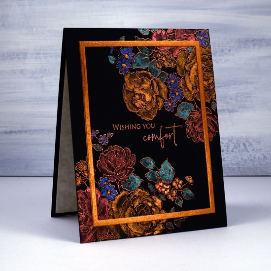 The fun continues around here with pearlescent paints and black watercolour paper. I just wish the photos would show better how pretty the shimmery paints are.  The Foiled Fox sent me some yummy new paints from Coliro, I used the ‘ocean’ and the ‘vintage’ sets for this card. I also tried out the ‘penny’ embossing powder from Brutus Monroe. It is a copper colour which worked nicely with the paints I chose. I embossed part of the Penny Black ‘floral medley’ stamp in one corner of my black watercolour paper panel then flipped the panel and moved the stamp around a little before stamping more flowers on the other corner. I paired up a couple of stamps from the PB ‘strength’ sentiment set to emboss a sentiment in between the florals.