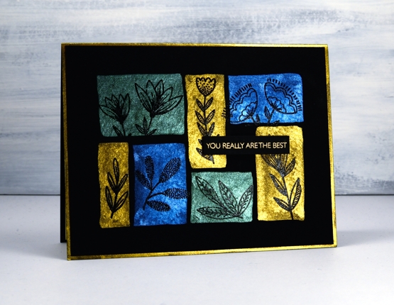 I embossed a sentiment from ‘million thanks’ on neenah black cardstock and popped it up over the painted shapes. I wanted a gold frame around the panel but could not find the exact gold in my stash so instead I painted the same gold paint from the Coliro earth set around the edges of the black card front. Painting your own mats and borders with matching ink or paint is a great way to get a perfect match.