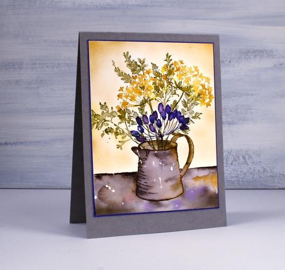 Stunning card and love the composition! I have a large water pitcher die that I’ve cut from copper foil and then filled with flowers…it was pretty but my flower arranging needed work. Like the way you grounded the flowers/pitcher as well. Thanks for inspiration…