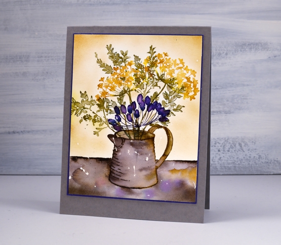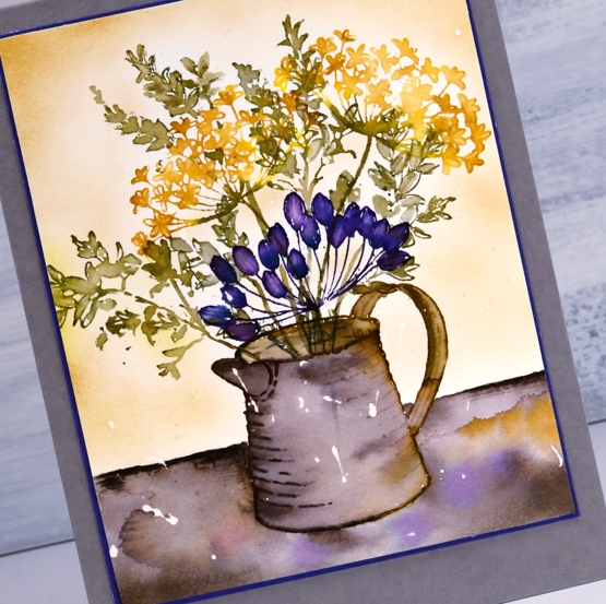I worked on hot pressed watercolour paper with some masking fluid splattered on it. I stamped the jug first in papertrey ink cubes ‘smokey shadow’ and ‘cocoa bean’. I blended the inks to fill the jug, adding extra ink from my glass mat where necessary. I let the jug dry before adding flowers and foliage. The leaves and flowers I inked with bright buttercup and olive twist ink cubes. I spritzed them lightly with water before stamping and did minimal blending with a very small brush on the panel. At this point it looked a little ho-hum so I took a chance and stamped another flower in ‘royal velvet’ and ‘enchanted evening’. Can we take a second to wonder how these delightful ink names are chosen? I think I would have fun with that job!  The purple flowers definitely added some contrast but it was still a bit of a patchy design; it lacked depth. I ruled a line of black soot ink across the panel then blended the ink downwards adding cocoa bean and stormy sea inks I’d already used and a few drops of the buttercup and royal velvet.