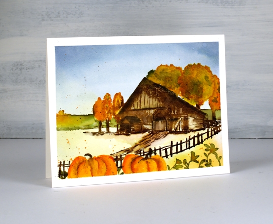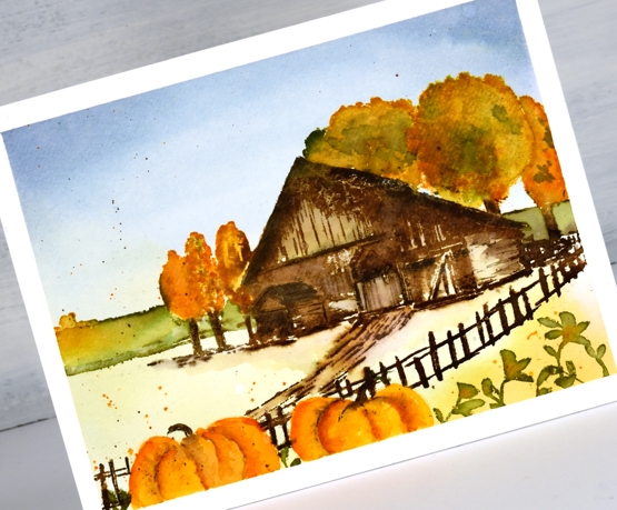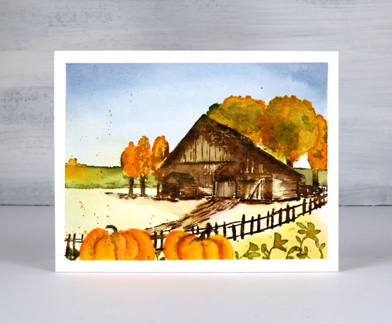 I worked in the stamp positioner for this one and there was masking involved too. I lightly stamped just the barn first, cut a mask for the roof then stamped an extra tree behind the barn. I also painted the back field in peeled paint and wild honey before returning to the trees and barn. I used the ink, stamp & blend process to build up the scene. I made sure I didn’t stamp the fence or track leading to the barn as I was planning to stamp something in the foreground. It turned out to be pumpkins which also needed to be masked before I added the fence and track.