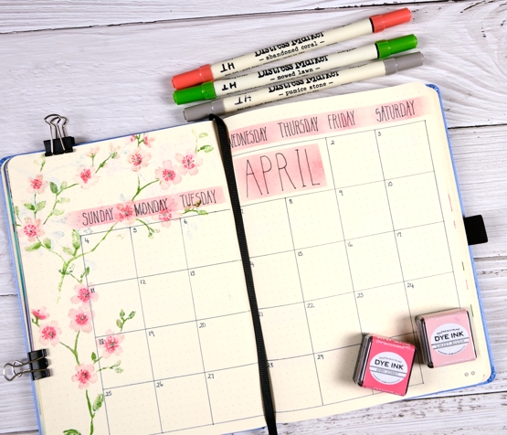 I used the same blissful blossom stamp from Penny Black that I used on the title page and to-do list. This time I masked some strips for blending pink before writing the days and the month title. You can see some evidence of bleed through in the top left corner but it’s just blossom so I like the shadowy effect.