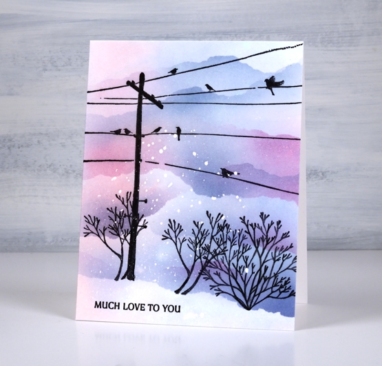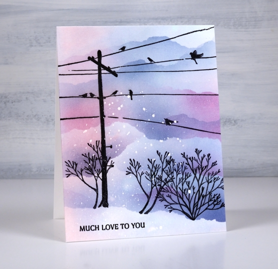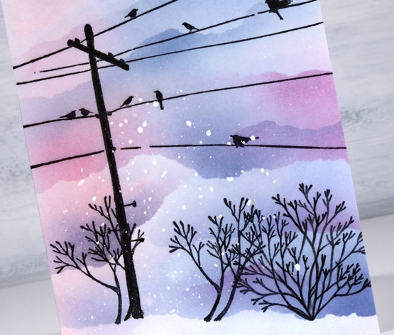 I worked on a piece of hot pressed watercolour paper but you could do this design on normal white cardstock by leaving out one step. I splattered masking fluid over the panel then when it was dried swiped it through some kitsch flamingo and faded jeans ink. The swipe gave me a pale blue, pink and purple background. I stamped the telegraph pole first with jet black archival ink then decided to mask a snow bank at the base of the panel. Even though the panel was already coloured I blended more colour above the mask to make the sky darker than the foreground snow. While the mask was in place I stamped all the plants along the edge.