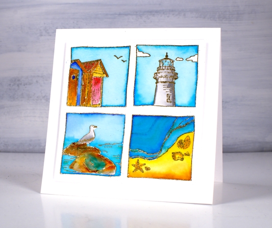 The sea theme is followed through beautifully with the wonderful summer bright colours for the four panels Heather and love the gold embossed outlines which add more wonderful shine. x