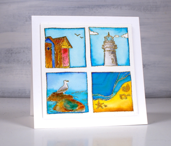 The sea theme is followed through beautifully with the wonderful summer bright colours for the four panels Heather and love the gold embossed outlines which add more wonderful shine. x
