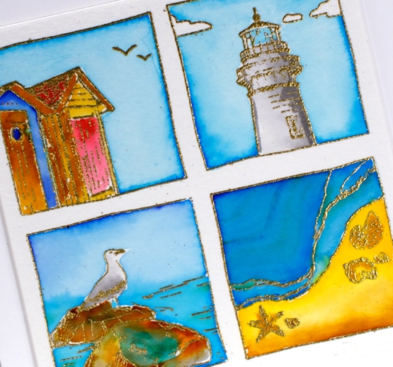I am having fun with the Foiled Fox again today showing you all four stamps from the Simply Graphic’s seaside set. I used the lighthouse and the beach huts stamps in Wednesday’s cards. Today I arranged all four stamps in the stamp positioner then stamped with versamark on cold pressed watercolour paper before embossing in gold powder.