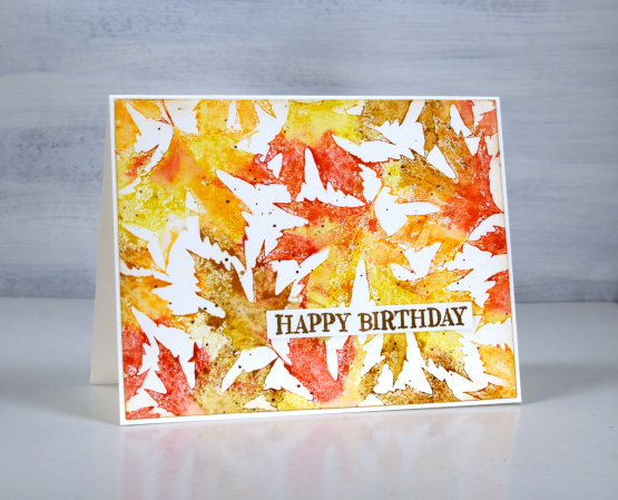 I blended the inks with a paintbrush and water but didn’t blend every scrap of leaf. I used a light hand so as to make colour blend into colour but still leave the texture detail showing through here and there. Thanksgiving has come and gone here in Canada but there are autumn birthdays coming up so I used a stamp from the DD happy birthday set, stamped in vintage photo archival ink.