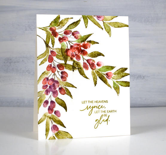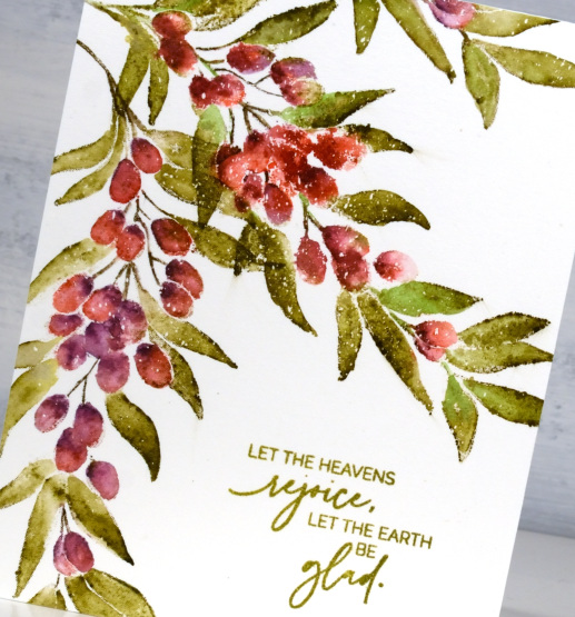With this many small leaves and berries I work in a stamp positioner and sometimes ink the stamp with one ink pad and then remove ink where I don’t want it. I stamp that first colour or in the case of the leaves, the mix of forest moss and mowed lawn and, because I had wiped ink off the berries, they will be unstamped (ideally!). I switched to markers to ink the berries, stamping a couple of times to build up shadow and depth. Once all the leaves and berries are inked I blend with a paintbrush and water to fill the shapes.